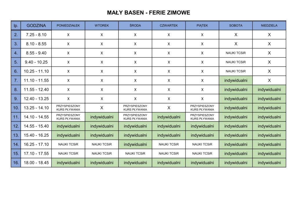 Poniżej przedstawiamy grafiki wejść na basen w okresie ferii