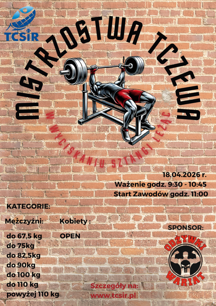 Zapraszamy na kolejną edycję Mistrzostw Tczewa w Wyciskaniu Sztangi Leżąc, które odbędą się 18.04.2026r !